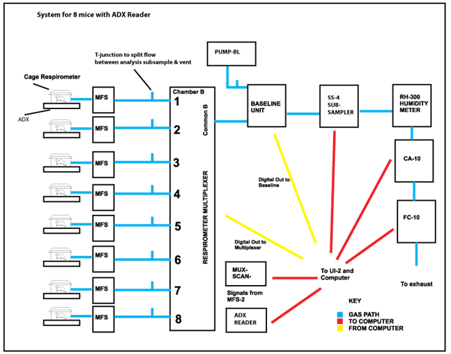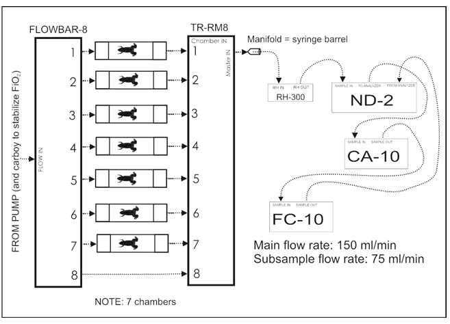 多通道陸生動物呼吸代謝測量系統(tǒng)由二氧化碳分析儀、氧氣分析儀、多通道氣路轉換器、氣流控制器、數(shù)據(jù)采集器及程序軟件、呼吸室等組成??筛鶕?jù)研究內容及經(jīng)費預算定制單通道至最多8通道(可同時測量7個動物的呼吸代謝)系統(tǒng),或選擇同時測量CO2、O2、RQ及H2O,亦可根據(jù)要求只選擇測量CO2或O2的測量系統(tǒng)。用于精確測量各種動物(昆蟲、兩爬、鳥類、哺乳類等等)呼出二氧化碳量及耗氧量等,并可計算呼吸商,廣泛應用于動物呼吸代謝有關的研究如病蟲害防治、預防醫(yī)學研究實驗、醫(yī)藥研究、動物生理學、動物生態(tài)學、遺傳學、運動生理學等。