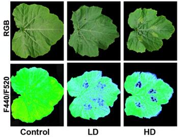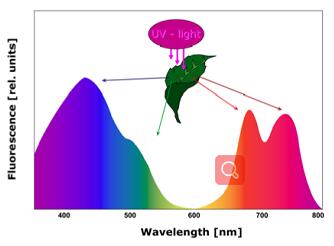 ü UV紫外光激發(fā)多光譜熒光成像技術(shù): UV紫外光對(duì)植物葉片激發(fā),可以產(chǎn)生具有4個(gè)特征性波峰的熒光光譜,4個(gè)波峰的波長(zhǎng)為藍(lán)光440nm(F440)、綠光520nm(F520)、紅光690nm(F690)和遠(yuǎn)紅外740nm(F740),其中F440和F520統(tǒng)稱(chēng)為BGF,由表皮及葉肉細(xì)胞壁和葉脈發(fā)出,F(xiàn)690和F740為葉綠素?zé)晒釩hl-F。紫外光激發(fā)多光譜熒光可以用來(lái)靈敏、特異性地評(píng)估植物生理狀態(tài)包括受脅迫狀態(tài),包括干旱、病蟲(chóng)害、環(huán)境污染、氮脅迫等