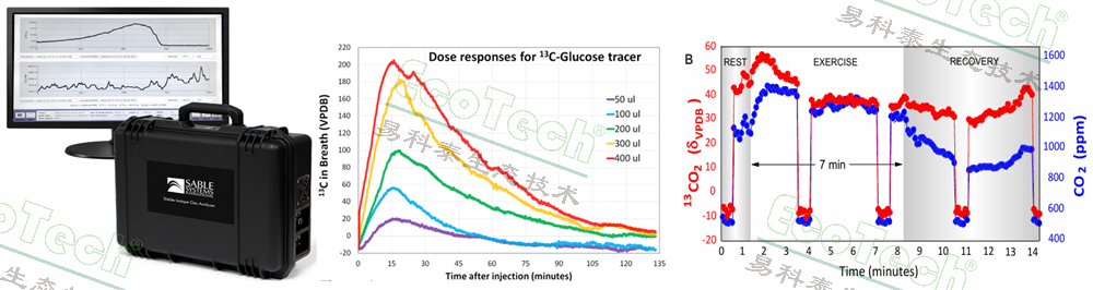 動物呼吸代謝測量可以得到二氧化碳產量、耗氧量、呼吸商等能量代謝指標,但不能跟蹤研究三種不同營養(yǎng)物質(能量來源物質如蛋白質、脂肪及碳水化合物)的實際利用情況,特別是外源性與內源性營養(yǎng)物的氧化等。國際知名動物能量代謝技術公司Sable Systems International新推出了動物呼吸穩(wěn)定同位素氣體分析儀,可與動物呼吸代謝測量系統(tǒng)搭配用于動物穩(wěn)定同位素呼吸代謝檢測以深入研究分析其能量代謝跟蹤底物消耗情況。該系統(tǒng)可廣泛應用于昆蟲、鳥類、蜥蜴、實驗大小鼠、家畜家禽、靈長類等各種實驗動物,以及人體碳同位素呼吸與能量代謝實時監(jiān)測,非常有助于推動動物生理生態(tài)、營養(yǎng)學、比較生理學、運動科學、病理學、生物醫(yī)學等領域生物新陳代謝創(chuàng)新研究。