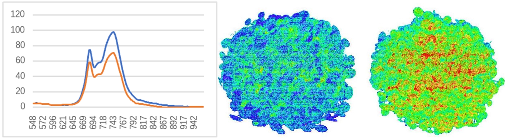 左圖:銅錢草葉綠素?zé)晒夤庾V,其中藍(lán)色曲線為施加敵草隆(DCMU)、紅色未施加敵草?。挥覉D:銅錢草太陽光誘導(dǎo)葉綠素?zé)晒獬上?,其中左邊為未施加敵草隆,右邊施加敵草隆,施加敵草隆后由于PSII QA電子傳遞被抑制(光化熒光淬滅阻斷),葉綠素?zé)晒庠鰪?qiáng)(上述數(shù)據(jù)均來自易科泰光譜成像與無人機(jī)遙感技術(shù)研究中心)