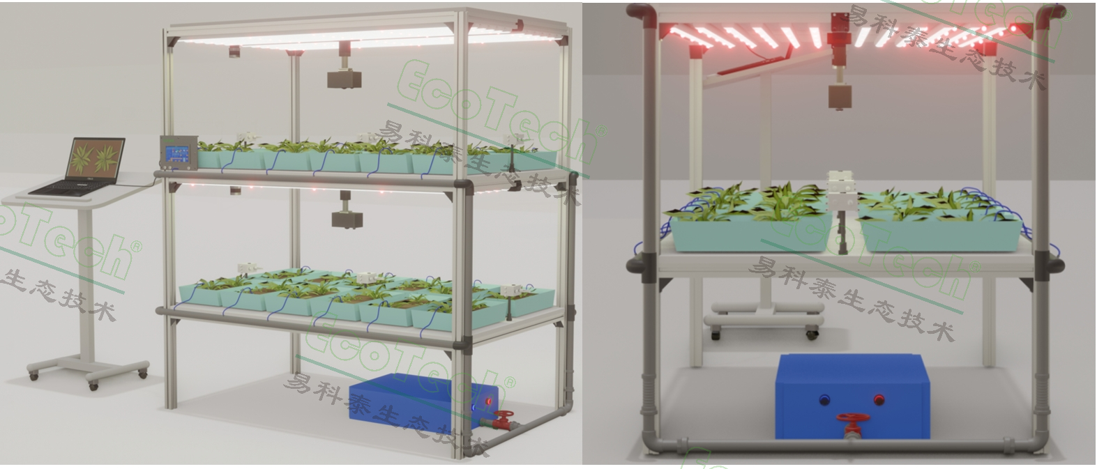 數(shù)字化植物工廠實驗監(jiān)測系統(tǒng),是易科泰最新推出的自主研發(fā)專利技術(shù)產(chǎn)品(ZL 2024 2 1728504.0),專門針對植物工廠、智慧農(nóng)業(yè)技術(shù)領(lǐng)域?qū)嶒灡O(jiān)測應用。系統(tǒng)集多通道智能LED光源培養(yǎng)、多傳感器表型性狀在線監(jiān)測功能于一體,同時可配套數(shù)字化培養(yǎng)設(shè)施、自動澆灌施肥、環(huán)境監(jiān)測及遠程控制功能。應用于數(shù)字化、智能化植物培養(yǎng)及表型性狀在線監(jiān)測,通過提供不同光譜組合、光強以實驗模擬不同光配方對植物的生長和生理生化的影響,研究最佳光配方等。通過RGB成像、葉綠素熒光成像、高光譜成像等先進技術(shù),高通量、非損傷、非接觸、數(shù)字化、可視化檢測植物生長、生理狀態(tài)、生化指標如光合效率、健康指標、衰老成熟指標、脅迫、色素含量指標、黃酮醇含量指標、次級代謝產(chǎn)物等,用來全方位實驗模擬植物從育種培養(yǎng)、生長監(jiān)測、環(huán)境控制及干預、長勢及品質(zhì)評價等全生命周期過程。