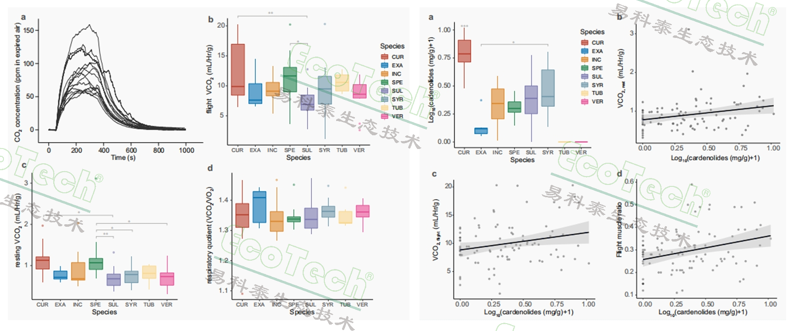 圖1. 成蟲(chóng)的能量代謝特征與宿主乳草的關(guān)系;強(qiáng)心苷與代謝率、肌肉特征的關(guān)聯(lián)
