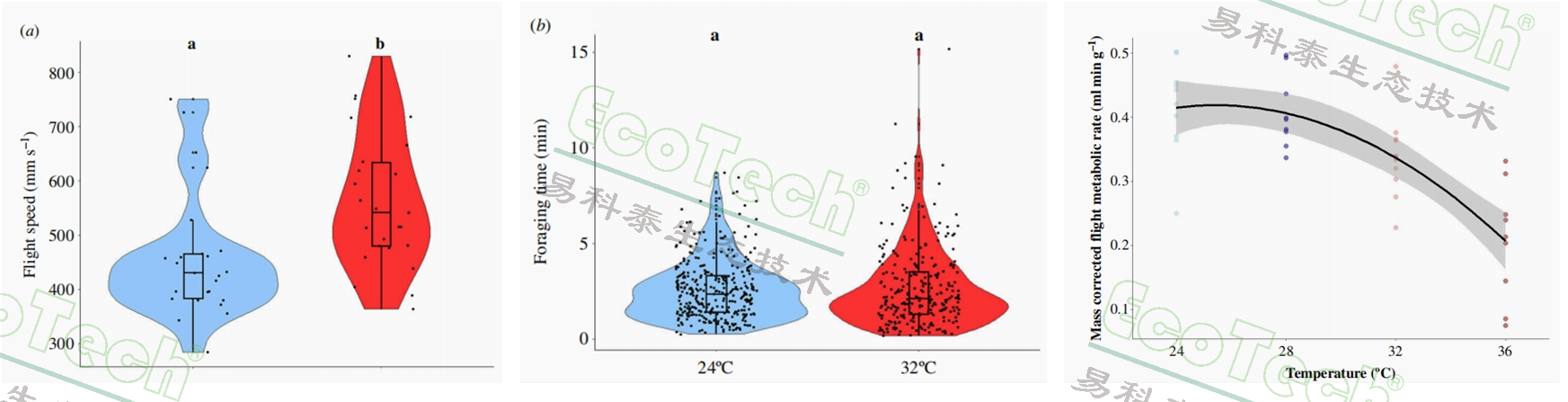 昆蟲(chóng)中傳粉者對(duì)野生植物群落和農(nóng)業(yè)生產(chǎn)力至關(guān)重要,但全球范圍內(nèi)其豐度和多樣性正下降。氣候變暖是傳粉昆蟲(chóng)的主要威脅之一,可影響昆蟲(chóng)發(fā)育、形態(tài)、代謝及行為。瑞典科學(xué)團(tuán)隊(duì)從溫度變化入手,研究氣候變暖條件下熊蜂覓食行為及代謝機(jī)制的變化。實(shí)驗(yàn)結(jié)果顯示飛行代謝率隨溫度升高而顯著降低。其中高溫下熊峰的飛行代謝率降低可能是因?yàn)榧∪忸A(yù)熱耗能減少,使熊蜂能更快飛行、更多訪(fǎng)花而不增加能耗;但高溫也會(huì)引發(fā)熱應(yīng)激,導(dǎo)致單蜂覓食次數(shù)減少。這種覓食行為的改變可能會(huì)破壞植物 - 傳粉者互作,雖然高溫下熊蜂訪(fǎng)花更頻繁,但可能因訪(fǎng)花時(shí)間短導(dǎo)致花粉傳遞不足;且單蜂覓食次數(shù)減少、更多工蜂參與覓食可能降低蜂群效率(如哺育),間接影響植物授粉成功率。