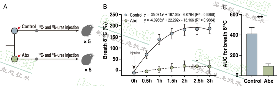 圖A)實驗設計示意圖(每組n=5只鼠兔);(B)13C-尿素示蹤的Abx鼠兔和對照鼠兔的平均呼氣δ13C,箭頭表示腹膜內注射13C-尿素;(C)根據(jù)(B)中的呼吸δ13C數(shù)據(jù)計算的曲線面積(AUC)。
