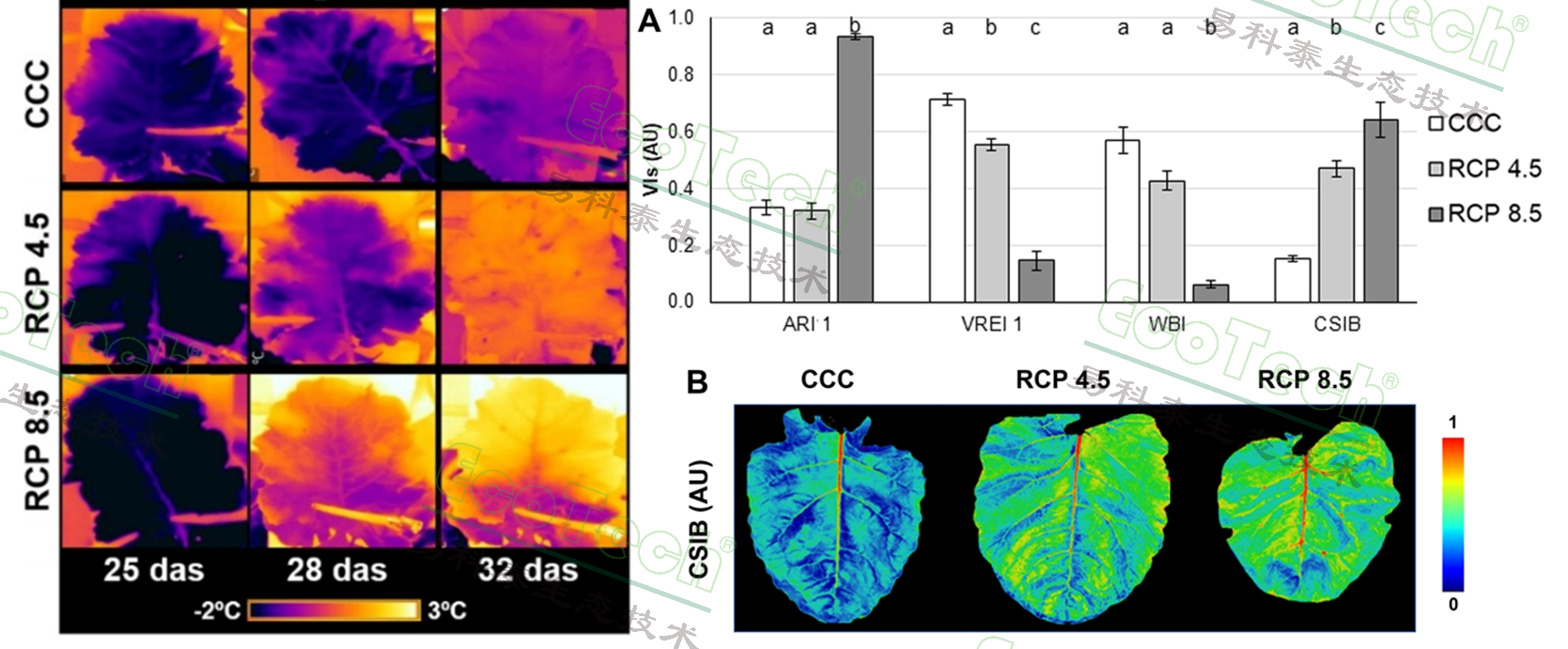 除了多光譜熒光成像技術(shù)外,紅外熱成像和高光譜成像技術(shù)也發(fā)揮了協(xié)同作用。在RCP情景下,溫度升高可能是氣候變化引起蒸騰減少的結(jié)果,而高光譜成像測量的植被指數(shù)(VIs)顯著下降,表明植物活力降低。通過提出新的植被指數(shù),并結(jié)合紅外熱成像和高光譜成像技術(shù),研究人員能夠更全面地評(píng)估油菜的生理狀態(tài)和健康狀況。