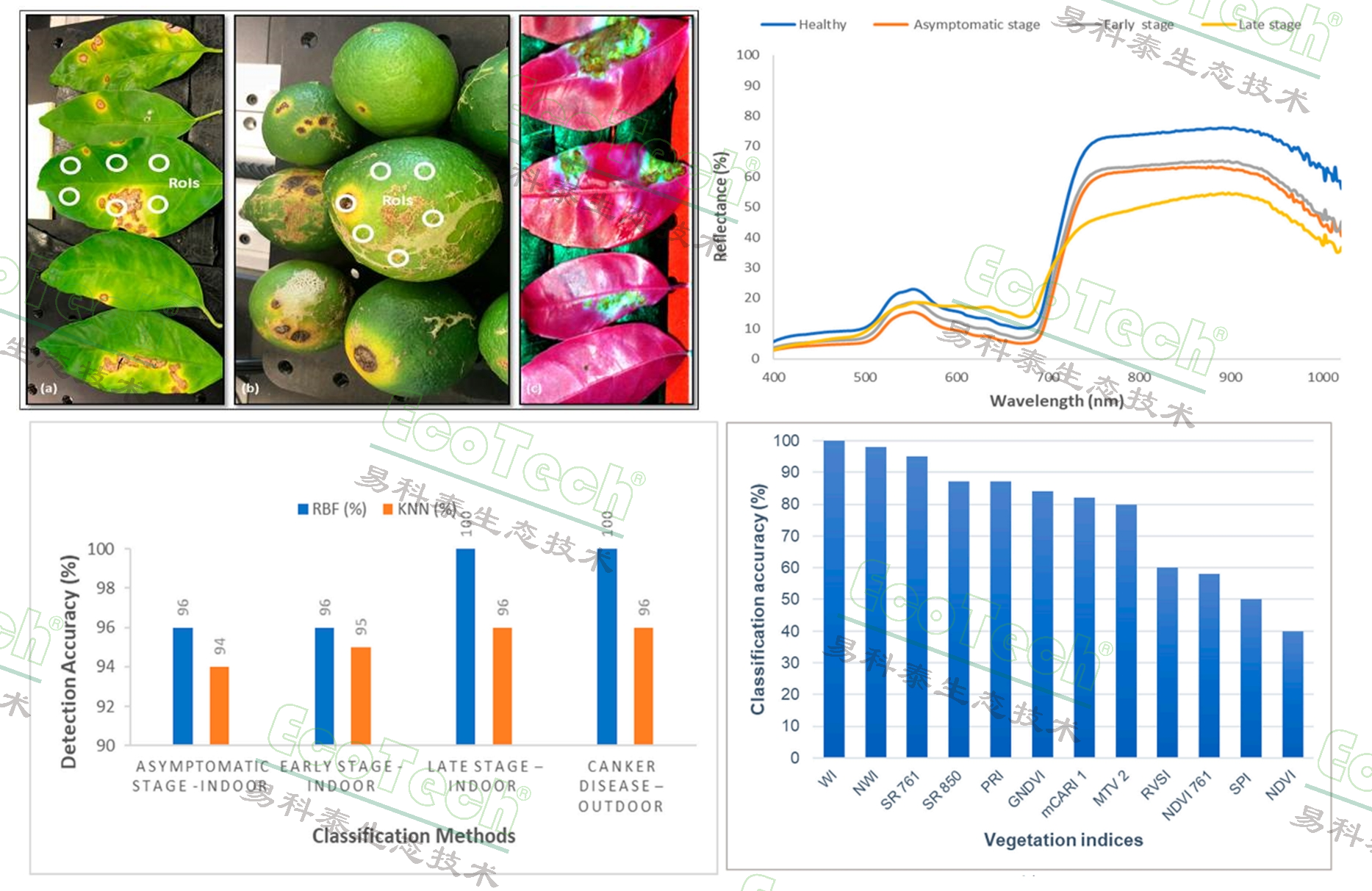 上左圖:葉子(a)和未成熟果實(shí)(b)的ROI選區(qū)(白色圓圈)及葉子假彩色(c);上右圖:不同潰瘍病階段(健康、無(wú)癥狀、疾病早期和晚期)柑橘組織的光譜特征。下左圖:RBF和 KNN對(duì)不同潰瘍病階段柑橘組織的分類精度圖;下右圖:RBF 方法使用不同VI 對(duì)健康和無(wú)癥狀階段柑橘組織的分類準(zhǔn)確率(參考文獻(xiàn):Abdulridha J, et al. UAV-based remote sensing technique to detect citrus canker disease utilizing hyperspectral imaging and machine learning[J]. Remote Sensing, 2019)