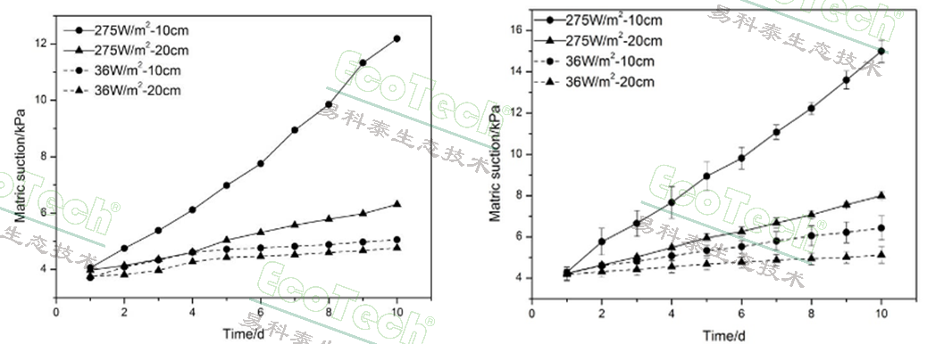 275 W/m²和36 W/m²光照下裸土基質(zhì)吸力的變化,左為裸土,右為植被覆蓋土