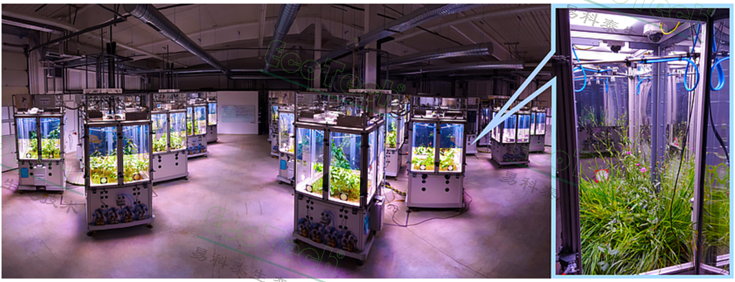 無論需要何種氣候條件,如從干燥到潮濕,從炎熱到寒冷,微風或颶風,強烈光照或高濕度,地下水位高或低,都可以通過ECOTRON集成系統(tǒng)進行模擬??刂茊卧ɡ缯彰?、灌溉、空調(diào))非常易于操作和控制。通過智能設(shè)備,可以隨時隨地通過大氣單元中的攝像頭了解實驗進展或植物生長情況。