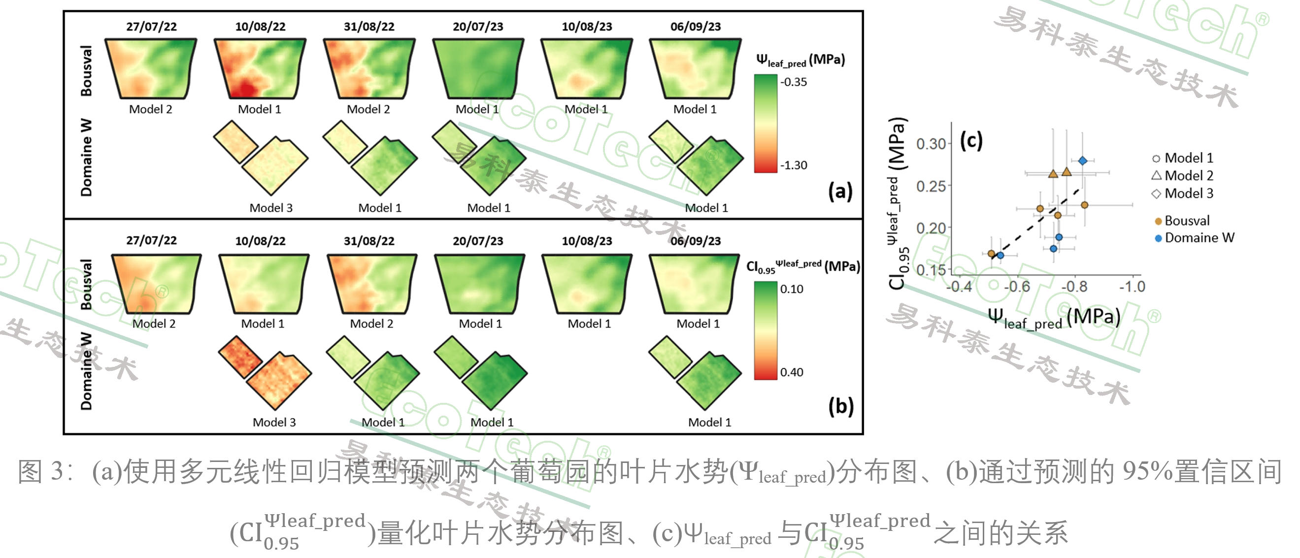 實驗結(jié)果顯示,在非灌溉葡萄園中,雖然地形因素(如坡度和海拔)對葡萄葉片水勢(Ψleaf)的差異有一定影響,但其空間分布差異主要還是受到葡萄園內(nèi)土壤質(zhì)地的異質(zhì)性(如黏土和沙土的混合)的影響,在土壤水分脅迫或蒸發(fā)需求(氣候條件影響)時尤為明顯。通過結(jié)合多光譜、熱成像和激光雷達(dá)數(shù)據(jù),研究者能夠有效的捕捉葡萄園內(nèi)葡萄葉片水勢的空間分布,這種方法不僅提高了預(yù)測的準(zhǔn)確性,還減少了預(yù)測的不確定性。