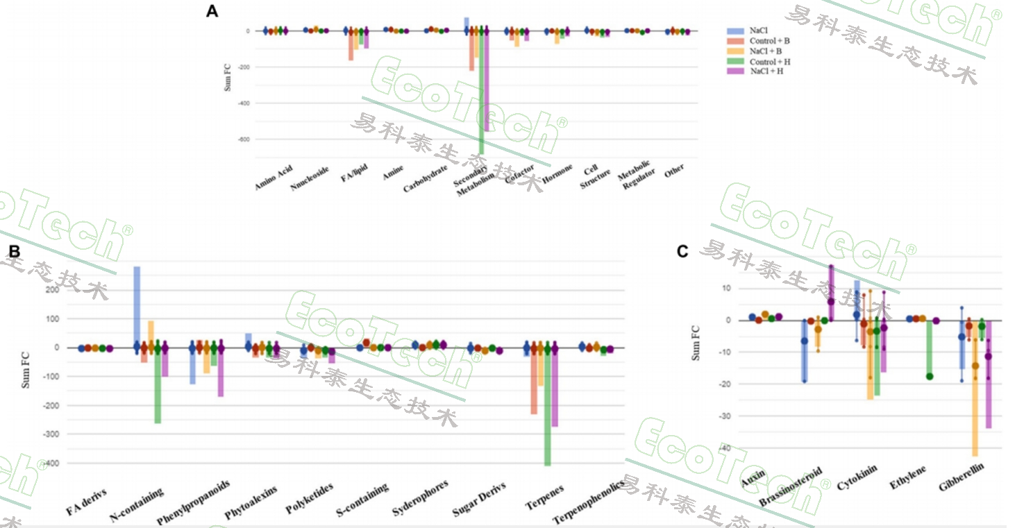 萵苣植物的代謝變化。與對照樣品相比,生菜植株的代謝過程(A)、次生代謝(B)和激素的生物合成受到了損害(C)