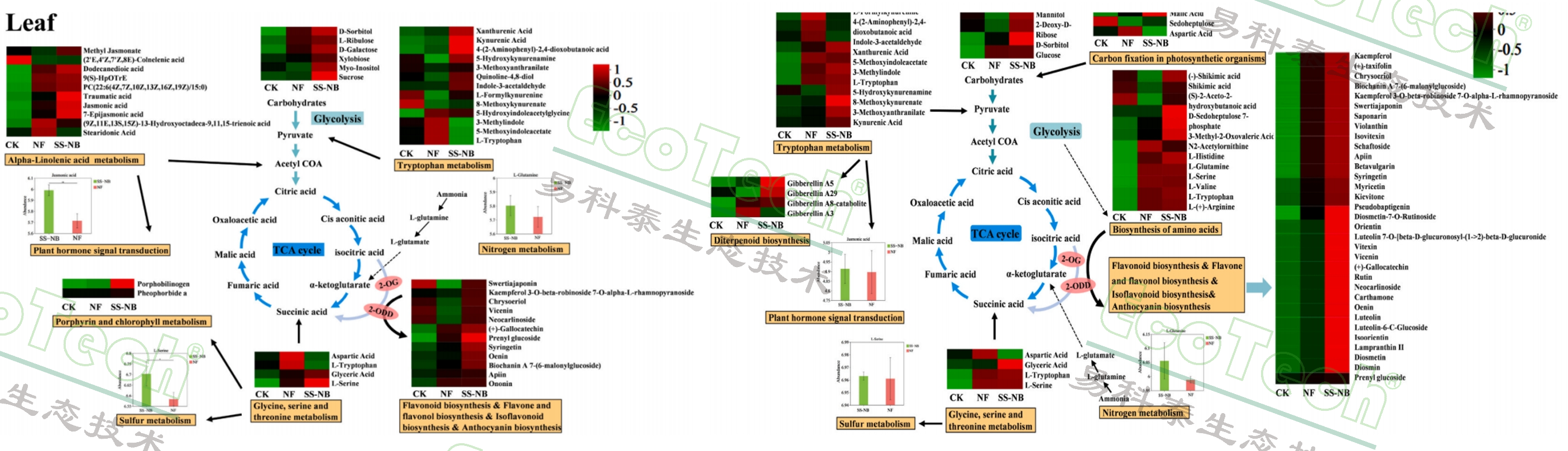 葉片和根系代謝組分析SS-NB在糖酵解到三羧酸(TCA)循環(huán)過程中引起的代謝產(chǎn)物的變化
