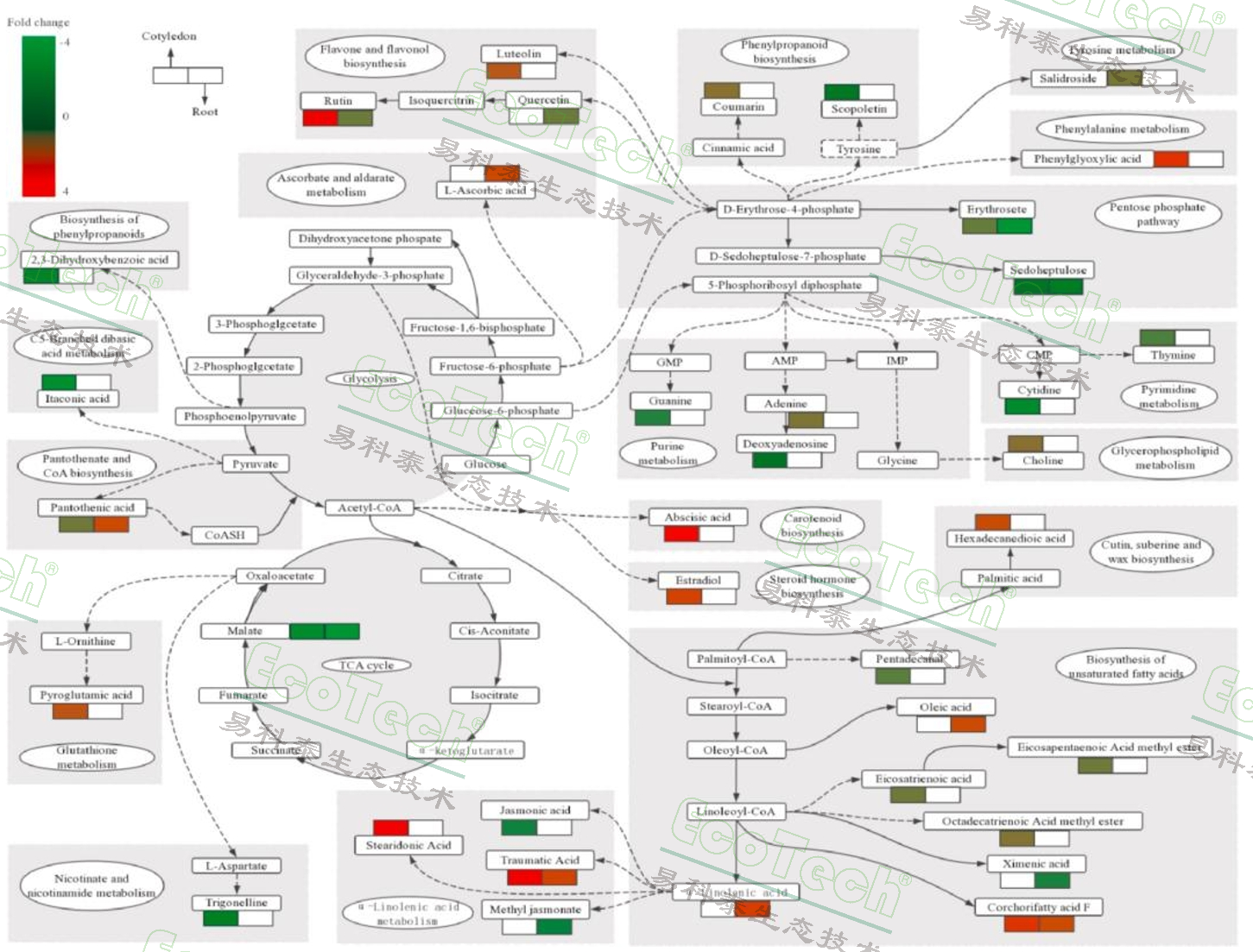 圖為鹽脅迫下蓖麻子葉和根代謝產(chǎn)物的途徑分析。通過KEEG途徑分析獲得的數(shù)據(jù)。代謝物含量的增加以紅色標(biāo)記,代謝物含量的減少以綠色標(biāo)記
