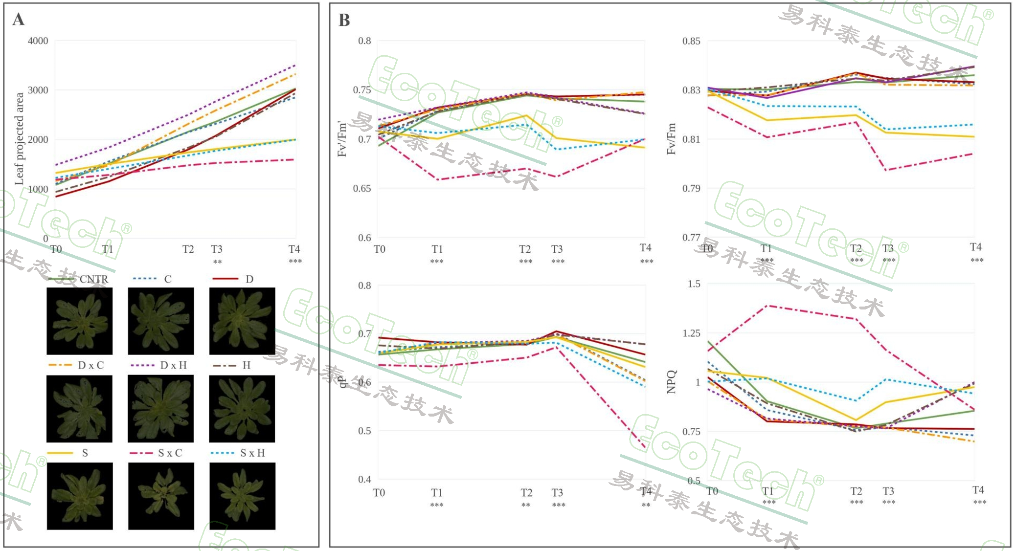 表型檢測結(jié)果顯示,鹽脅迫顯著減少了擬南芥的生長面積,而其他脅迫(高溫、低溫、干旱)在實(shí)驗(yàn)期間對生長面積影響不顯著。鹽脅迫從實(shí)驗(yàn)初期就影響了光系統(tǒng)II(PSII)的效率,導(dǎo)致代表光合作用效率的葉綠素?zé)晒鈪?shù)如Fv’/Fm’等下降。高溫脅迫在T4顯著增加了非光化學(xué)淬滅(NPQ),表明熱應(yīng)力下植物通過增加熱耗散來保護(hù)光合機(jī)構(gòu)。高溫和低溫脅迫,都沒有影響Fv/Fm,可能是由于處理時(shí)間較短。干旱脅迫的單一及組合處理均在9天的處理期內(nèi)未對光合作用機(jī)構(gòu)造成顯著影響,可能是短時(shí)間的脅迫未損傷PSII。