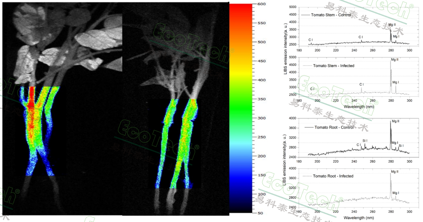 圖2. 左圖:感染根結線蟲的番茄莖葉綠素熒光成像對比圖;右圖:感染根結線蟲的番茄莖和根的LIBS元素對比光譜