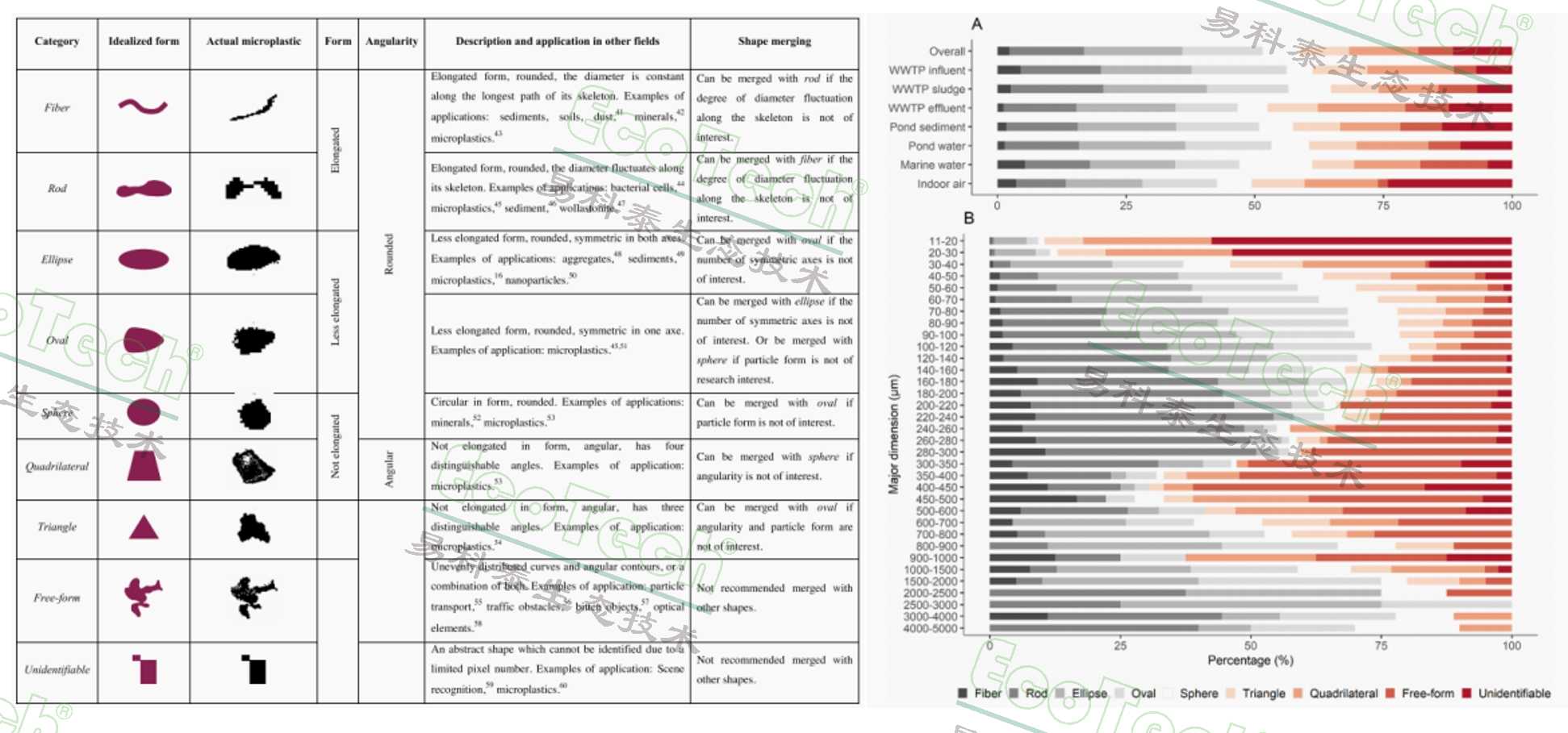 圖4. 左圖:不同環(huán)境微塑料理想形式的應(yīng)用參考形狀;右圖:(A)目視分辨后的形狀類別組成;(B)按尺寸分類后的形狀組成。