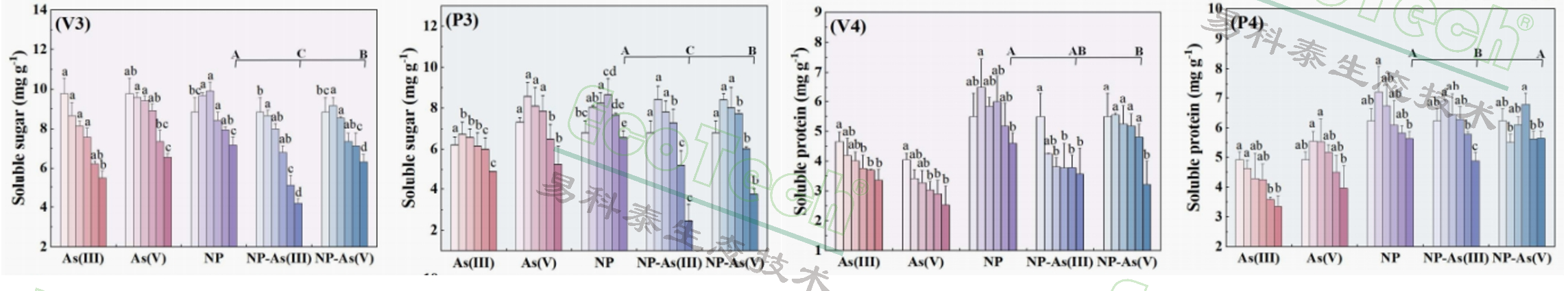 圖6. 上圖:金屬(As(III)和As(V)以及PS-NPs對苦草和菹草的葉綠素(V1、P1)、葉綠素?zé)晒猓╒2、P2)、可溶性糖(V3、P3)、可溶性蛋白(V4、P4)在14天內(nèi)的單一和聯(lián)合作用效果。