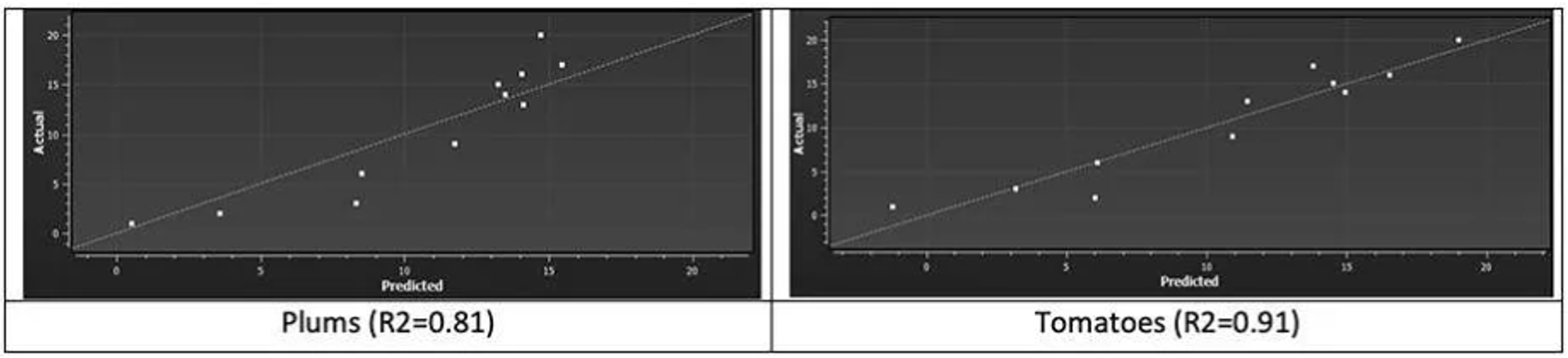 圖5:兩個(gè)模型的實(shí)際值與模型預(yù)測(測量李子和番茄的新鮮度)