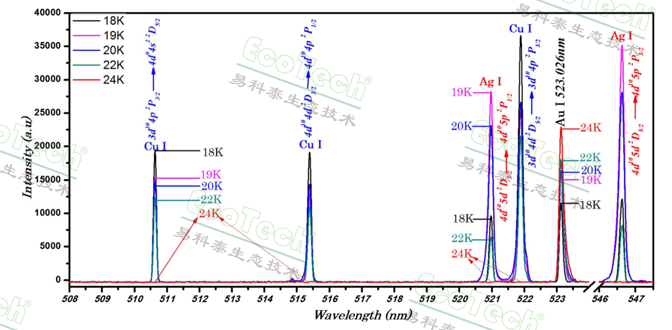 圖1. 不同 K 金中 Cu、Ag、Au 的譜線強(qiáng)度差異